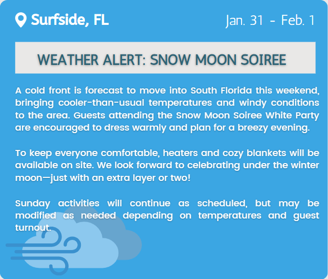 • Sunday, Feb. 1: Community Center will be closed to the public and only in use for designated Snow Moon soiree activities. The Beach Club will remain open, please check in at the window and use the public beach access to walk through.