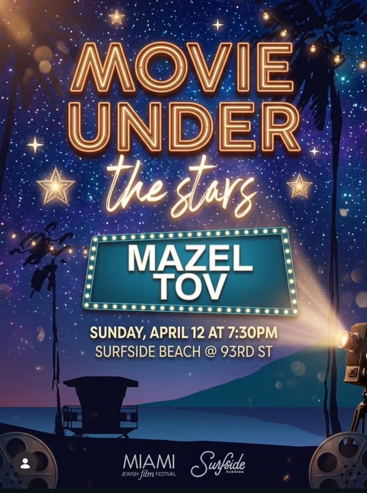 Join us for a fun evening under the stars on Sunday, April 12 at 7:30 p.m. at 93rd Street Beach for a special outdoor screening of Mazel Tov, presented in partnership with the Miami Jewish Film Festival (MJFF).