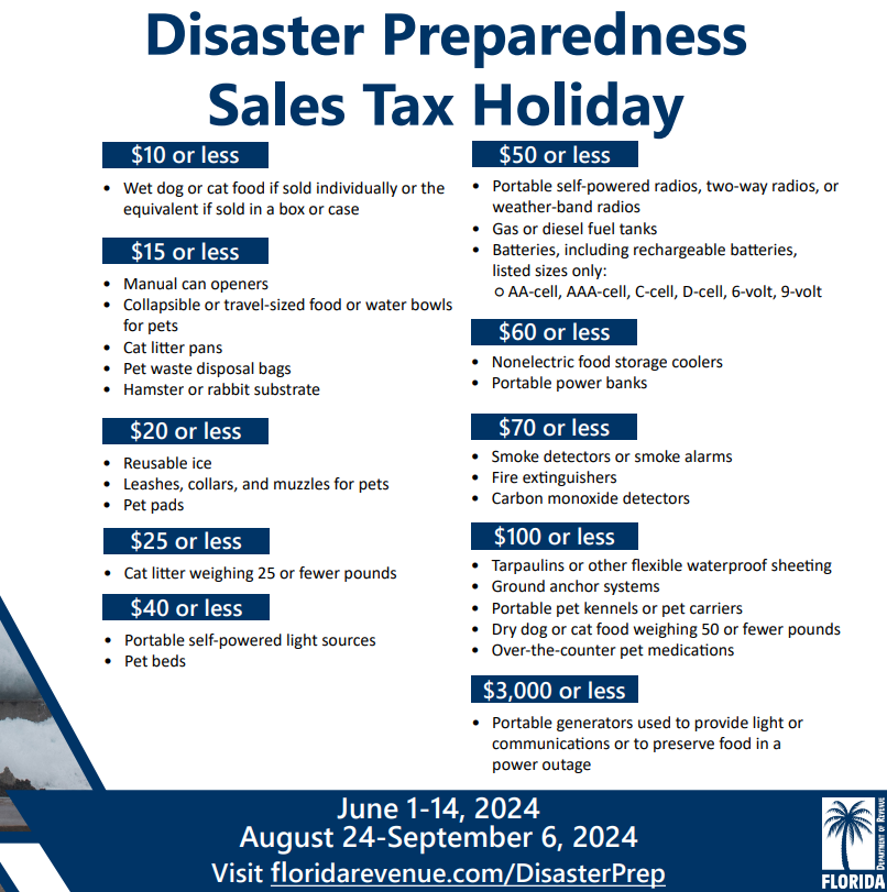 Consumers can purchase qualifying disaster preparedness supplies exempt from tax during the 2024 Disaster Preparedness Sales Tax Holiday which begins Saturday, June 1 and extends through Friday, June 14. A second exemption period will begin Saturday, August 24 and extend through Friday, September 6. Learn more about the Tax Holiday.