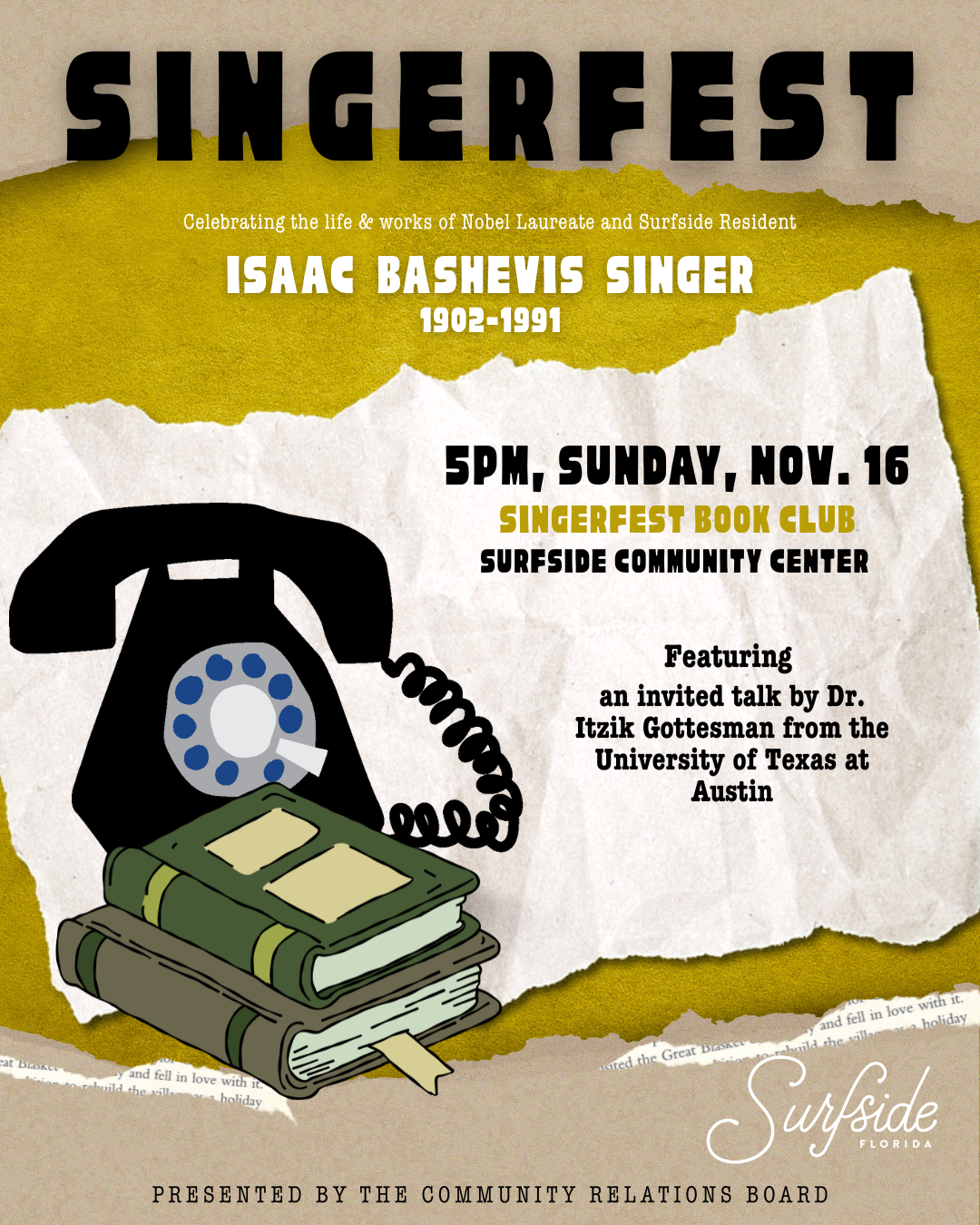 Surfside's Community Relations Board (CRB) invites you to the Book Club portion of Singerfest, a special celebration honoring Nobel Prize–winning author and former Surfside resident, Isaac Bashevis Singer. Readers and fans are invited to take part in a lively discussion led by Dr. Itzik Gottesman from the University of Texas at Austin exploring Singer’s timeless stories, rich in humor, mysticism, and human insight. The four stories that will be featured in the Book Club, "Gimpel the Fool," "Alone," "Old Love," and "The Last Demon," are part of The Collected Stories of Isaac Bashevis Singer.