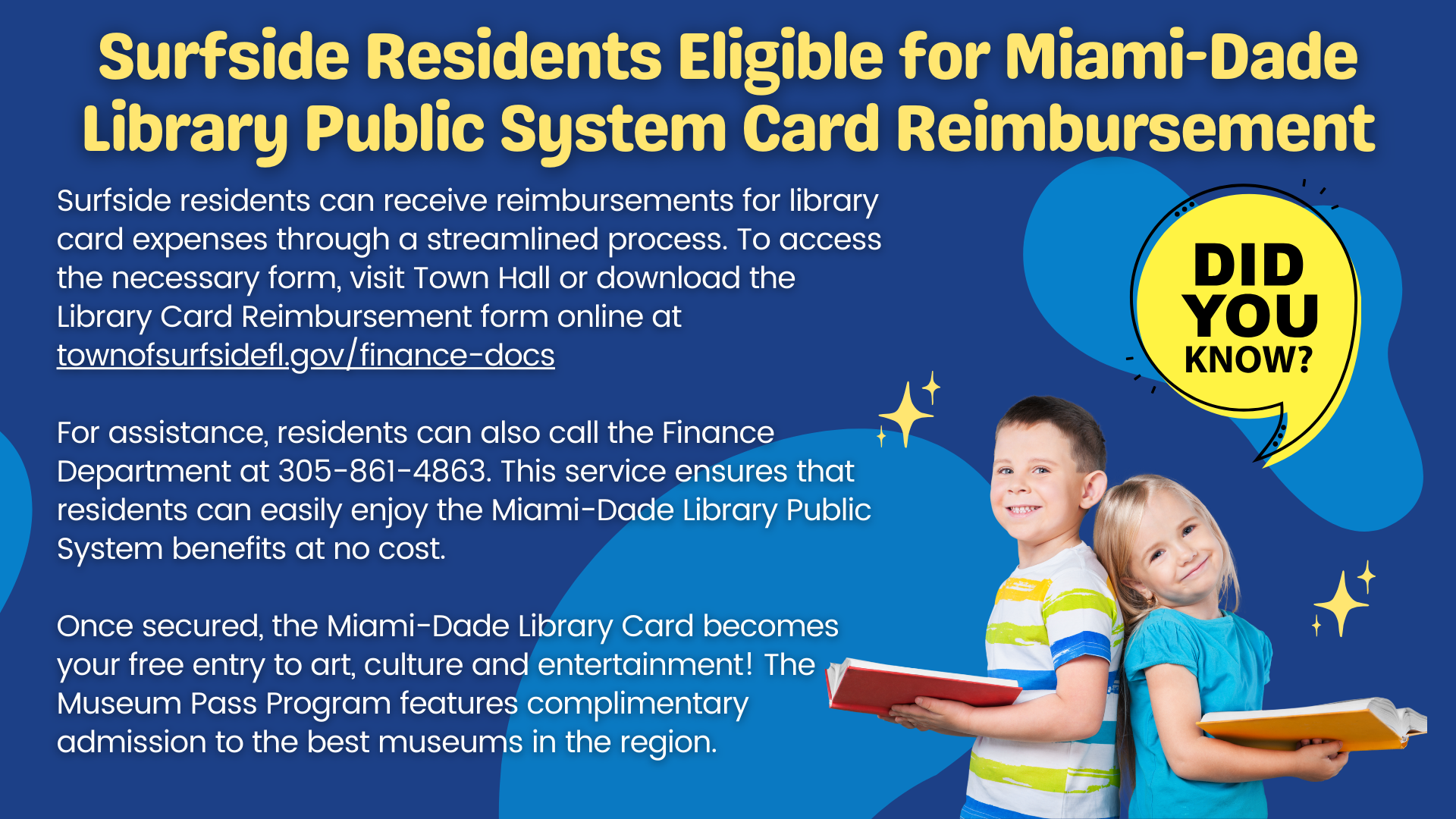 Surfsiders are encouraged to visit nearby library locations, including the Bay Harbor Islands Branch (1175 95th Street), Miami Beach Regional Library (227 22nd Street), and Sunny Isles Beach Branch Library (18070 Collins Avenue).