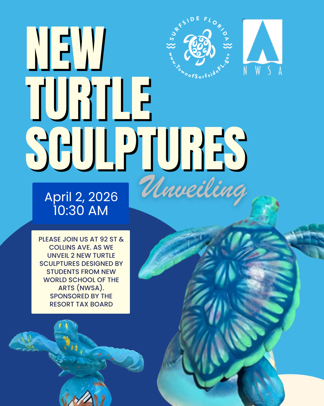 The Town of Surfside will kick off Earth Month by unveiling two new fiberglass turtle sculptures on Thursday, April 2, at the beach entrance located at 92nd Street and Collins Avenue. The colorful installations are the latest addition to the Town’s growing public art collection and have been individually designed by art students from New World School of the Arts (NWSA) as part of a Town initiative.